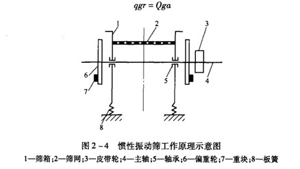 圖2-3和圖2-4分別是sZ型慣性振動篩的外形圖和工作原理示意圖。從圖中可以看出,這種篩子有8個主要組成部分,其中篩網(wǎng)固定在篩箱上,篩箱安裝在兩個橢圓形板簧上,板繭底座固定在基礎(chǔ)上,偏重輪和皮帶輪安裝在主軸上,重塊安裝在偏重輪上。改變重塊在偏重輪上的位置,可以得到不同的離心慣性力,以此來調(diào)節(jié)篩子的振幅。主軸通過兩個滾動軸承固定在篩箱上。篩箱一般呈15°―25°傾斜安裝,以促進物料在篩面上向徘料端運動。