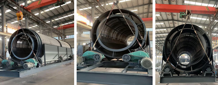 由鏟車上料,通過(guò)料斗上安裝的小振動(dòng)器振動(dòng)把料漏進(jìn)滾筒篩沙機(jī),物料進(jìn)入滾筒后,通過(guò)網(wǎng)孔進(jìn)行物料的分離,成品料會(huì)漏下來(lái),經(jīng)過(guò)皮帶機(jī)傳送出來(lái),廢料從滾筒尾部漏出。