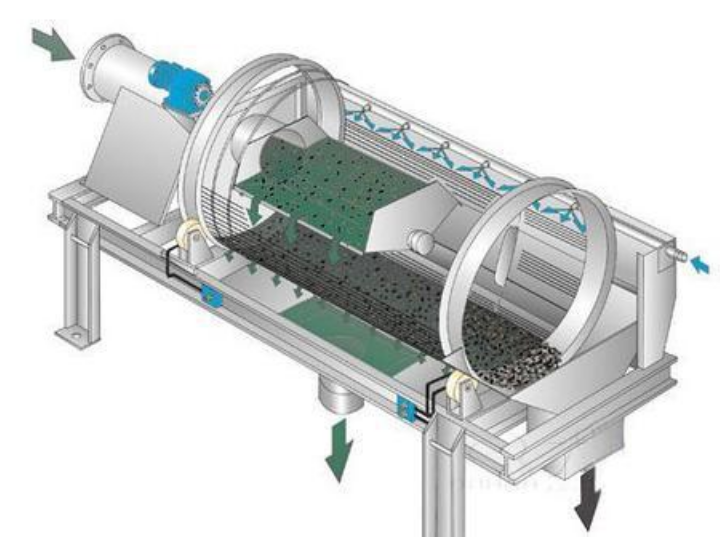 滾筒篩沙機(jī)主要有振動(dòng)電機(jī)、減速機(jī)、滾筒裝置、機(jī)架、密封蓋、進(jìn)出料口等部分組成,滾筒裝置傾斜安裝在機(jī)架上,電機(jī)經(jīng)減速機(jī)與滾筒裝置通過(guò)聯(lián)軸器連接在一起,驅(qū)動(dòng)滾筒裝置繞其軸線轉(zhuǎn)動(dòng)。