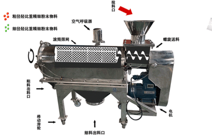 靈芝超微粉在 WQS30-100氣旋篩中如何進行篩分作用?靈芝粉置于機體內(nèi),物料通過螺旋輸送系統(tǒng)后,和氣流混合、霧化進入網(wǎng)筒內(nèi);通過網(wǎng)筒內(nèi)風輪葉片使物料同時受離心力和旋風推進力,從而近使物料噴射過網(wǎng),由細料排出口排出,不能過網(wǎng)的物料沿網(wǎng)筒壁從粗料排出口排出。