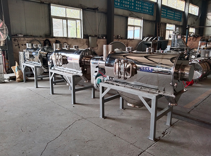 中藥粉臥式氣流篩是微細(xì)粉物料篩分的專(zhuān)用篩分機(jī)。微細(xì)粉物料易粘附、粒徑小、質(zhì)輕、易懸浮等特點(diǎn);國(guó)內(nèi)現(xiàn)有旋振篩,直線(xiàn)篩利用其重力勢(shì),激振力,彈力作業(yè)很難篩分,易引起粉塵飛揚(yáng),更難達(dá)到技術(shù)要求。針對(duì)這一情況,大漢工程技術(shù)人員經(jīng)過(guò)多年來(lái)研究試制,開(kāi)發(fā)出專(zhuān)門(mén)用于微細(xì)粉篩分的新產(chǎn)品――氣流篩。該機(jī)適合80-530目有網(wǎng)各種粉狀物料篩選分級(jí),其篩分效率高、產(chǎn)量大、自動(dòng)進(jìn)料排料、連續(xù)作業(yè)、無(wú)污染,使以往用各種振動(dòng)篩難以進(jìn)行高細(xì)度精密篩分作業(yè)成為易事。經(jīng)過(guò)對(duì)120-180目輕鈣、300目重鈣、400目活性鈣、300目山楂粉、320-500目鋅粉、500目氧化鐵黑、氧化鐵紅、120-160目中藥粉、180-270目石英粉等物料的篩分使用,測(cè)得每平方米篩網(wǎng)面積每小時(shí)產(chǎn)量均在一噸左右,同時(shí)測(cè)得篩分效率在95%以上,空氣含塵量低于10mg/m3。